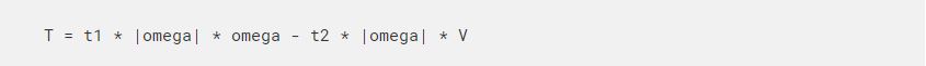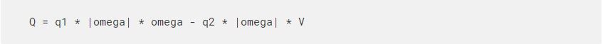 其中t1和t2是推力常數字段中指定的常數,ω是電動機角速度,V是推力中心沿軸心的線速度的分量。 推力施加在centerOfThrust字段內指定的點上。 合成轉矩是實數Q與單位長度軸軸線矢量的乘積,Q由下式給出: