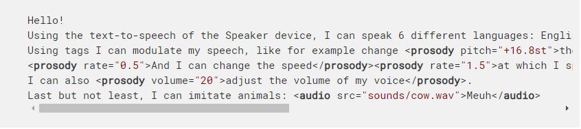 The wb_speaker_speak function allows the user to execute text-to-speech on the speaker. The value of the text parameter is converted into sound by Webots using the engine specified by the wb_speaker_set_engine function and the language specified by the wb_speaker_set_language function. The resulting sound is played through the specified speaker. The specified text could be plain text including punctuation signs such as "Hello world!", or can be enriched with special effects to make it more realistic. Such effects are specified with XML tags compliant with the SSML (Speech Synthesis Markup Language) standard. Here is a list of SSML tags that are supported by both the pico and the microsoft engines. Additional tags and parameters may be supported by the microsoft engine. Please refer to the Microsoft Speech API (SAPI) documentation about it.