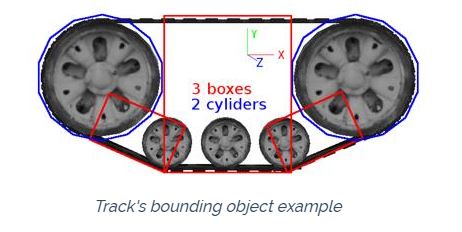 請注意,這僅在基於物理的仿真中有效。 因此,“跟踪”節點和相關“實體”節點的物理場和boundingObject字段必須為非NULL,才能使“跟踪”節點正確運行。 並不一定要求boundingObject完全匹配履帶的形狀; 可以使用基本的幾何形狀(例如盒子和圓柱體)來指定皮帶的外部形狀,尤其是皮帶可能接觸地面或障礙物的部分。 下圖顯示了一個簡單的示例。