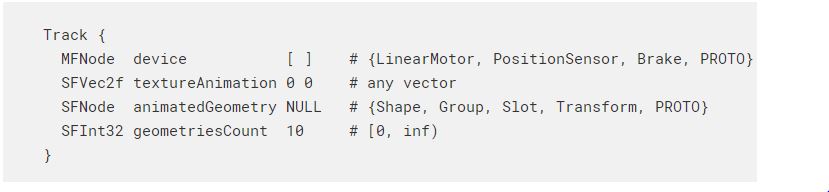 The Track node defines a track object that could be used to model tracks for conveyor belts or tank robots.